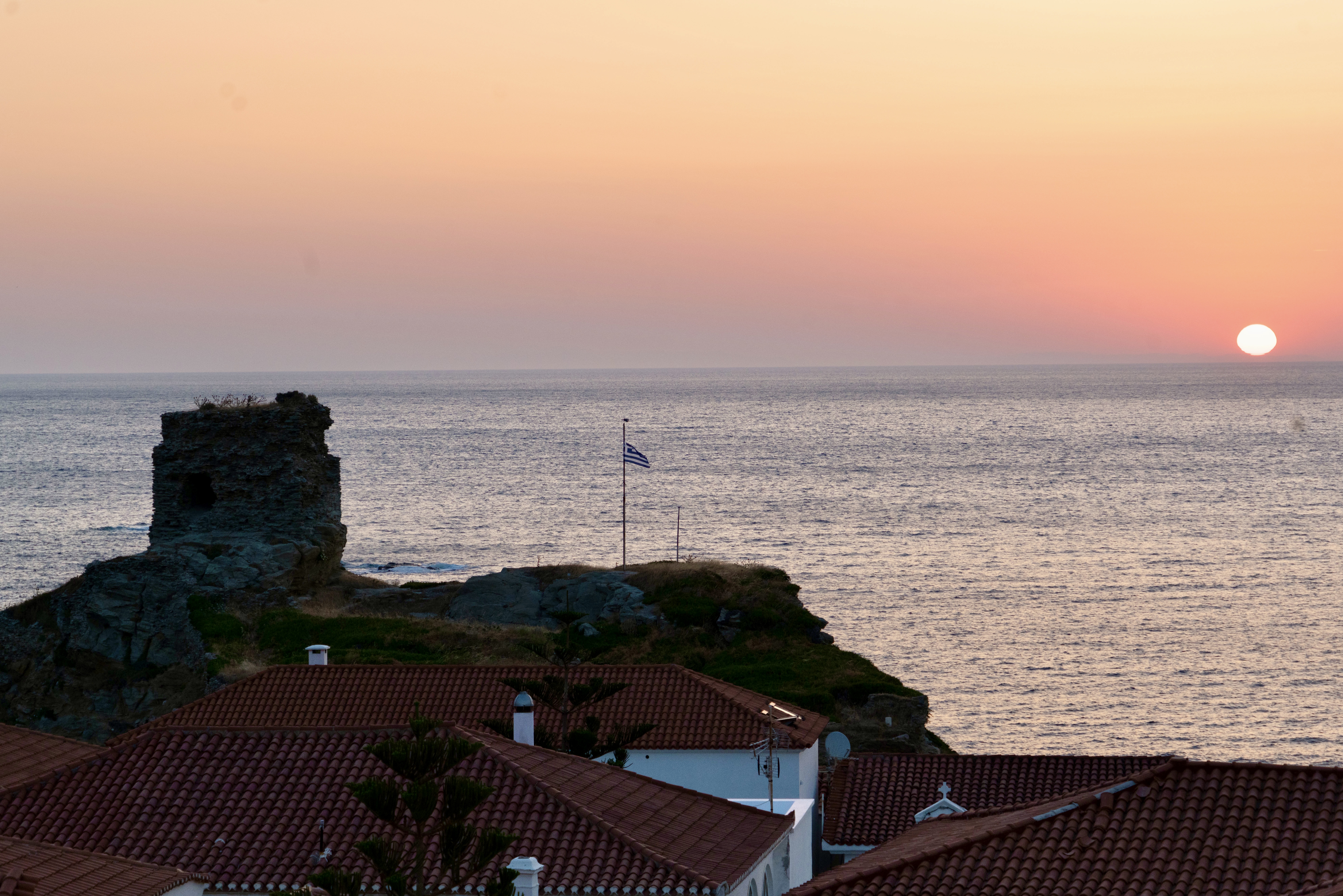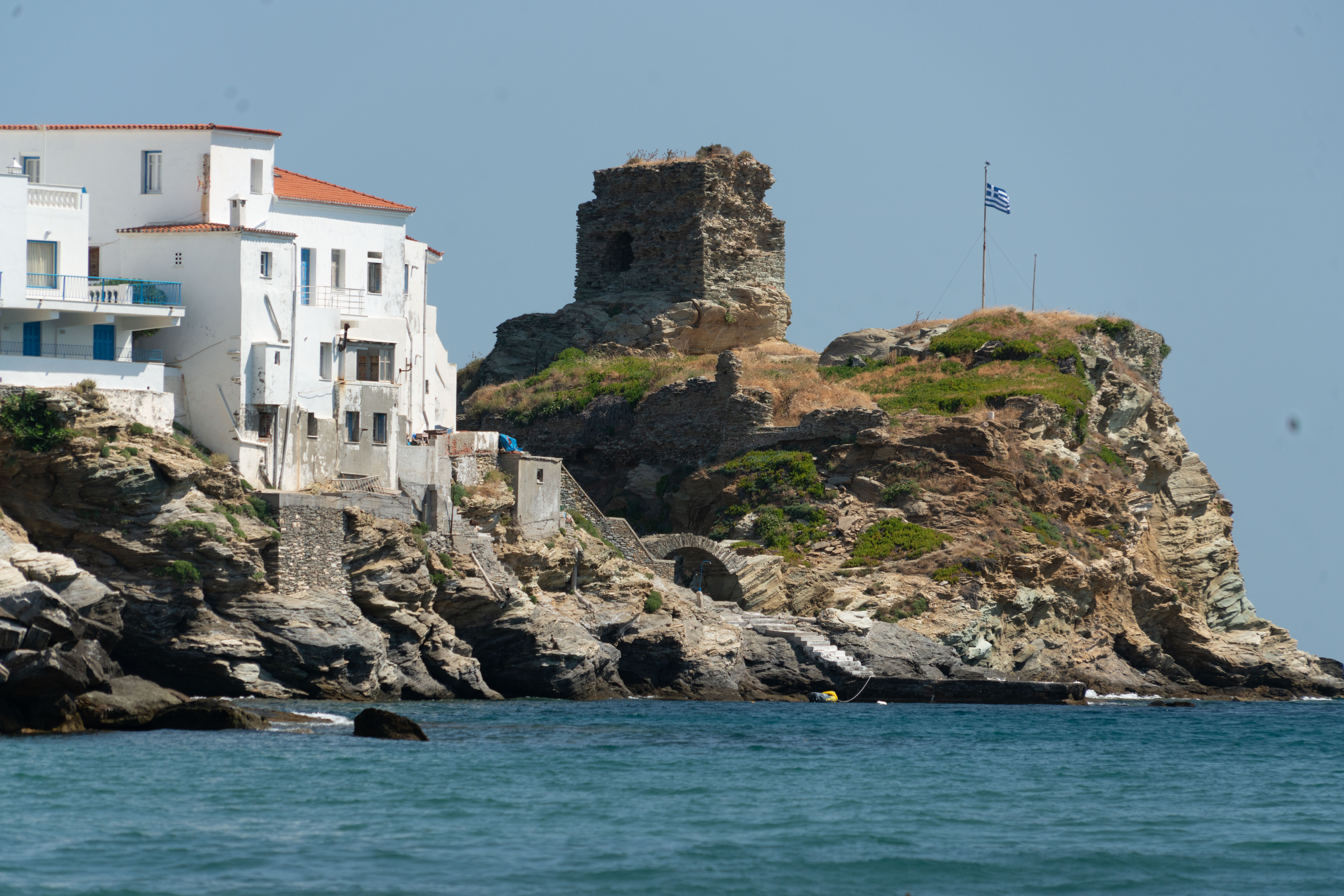 마을 중심을 지나 작은 언덕을 오르니, Chora의 요새가 모습을 드러냈다. 바다를 향해 우뚝 서 있는 요새는 오랜 세월의 흔적을 고스란히 간직한 채 굳건히 서 있었다. 거친 돌과 세월에 풍화된 벽면은 과거 이곳을 지키던 사람들의 이야기를 담고 있는 듯했다. 그 위에 서서 바라본 바다의 풍경은 압도적이었다. 파란 바다가 수평선까지 펼쳐져 있고, 그 위로 하얀 파도가 부서지는 모습은 마치 시간이 멈춘 듯한 고요함을 안겨주었다.