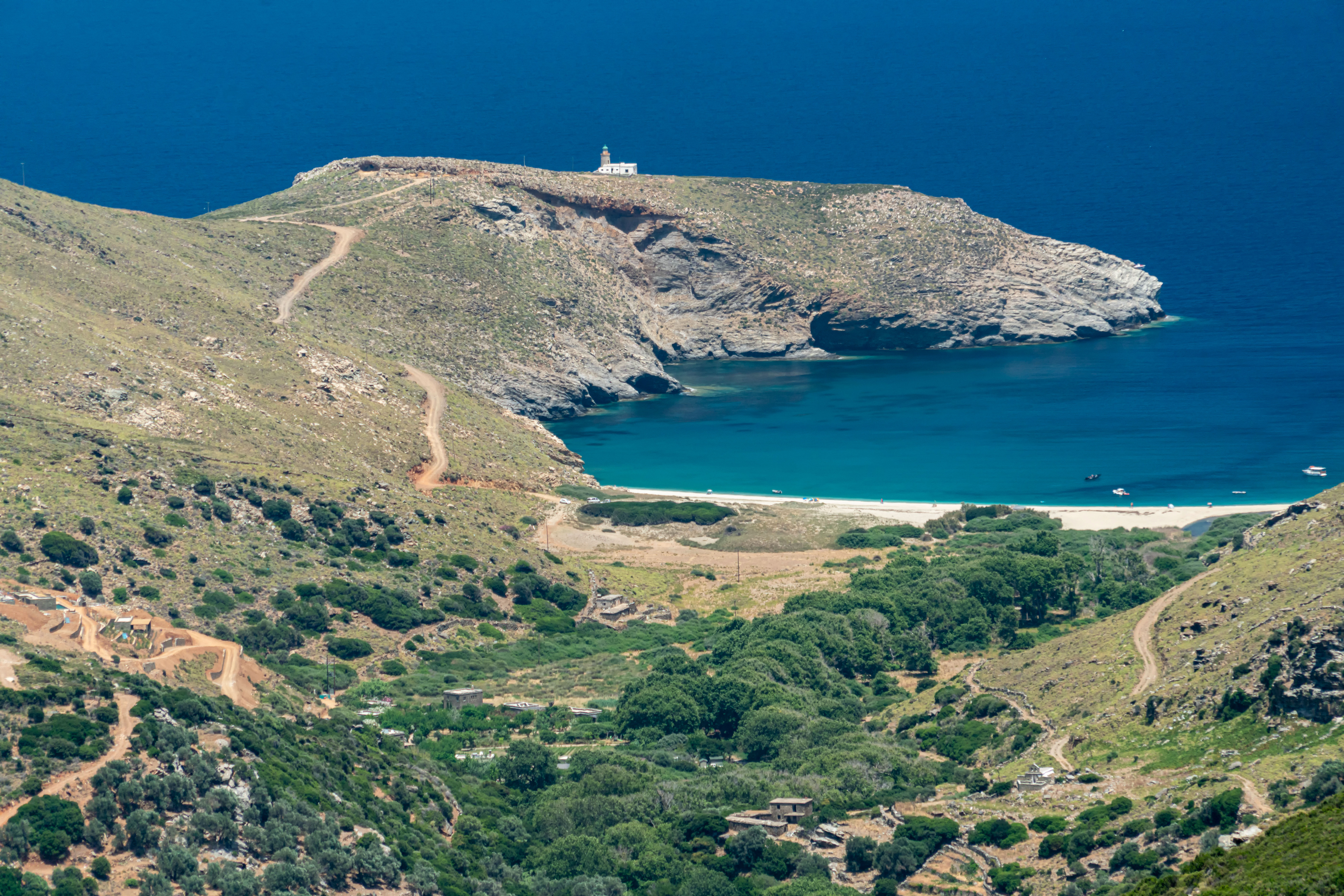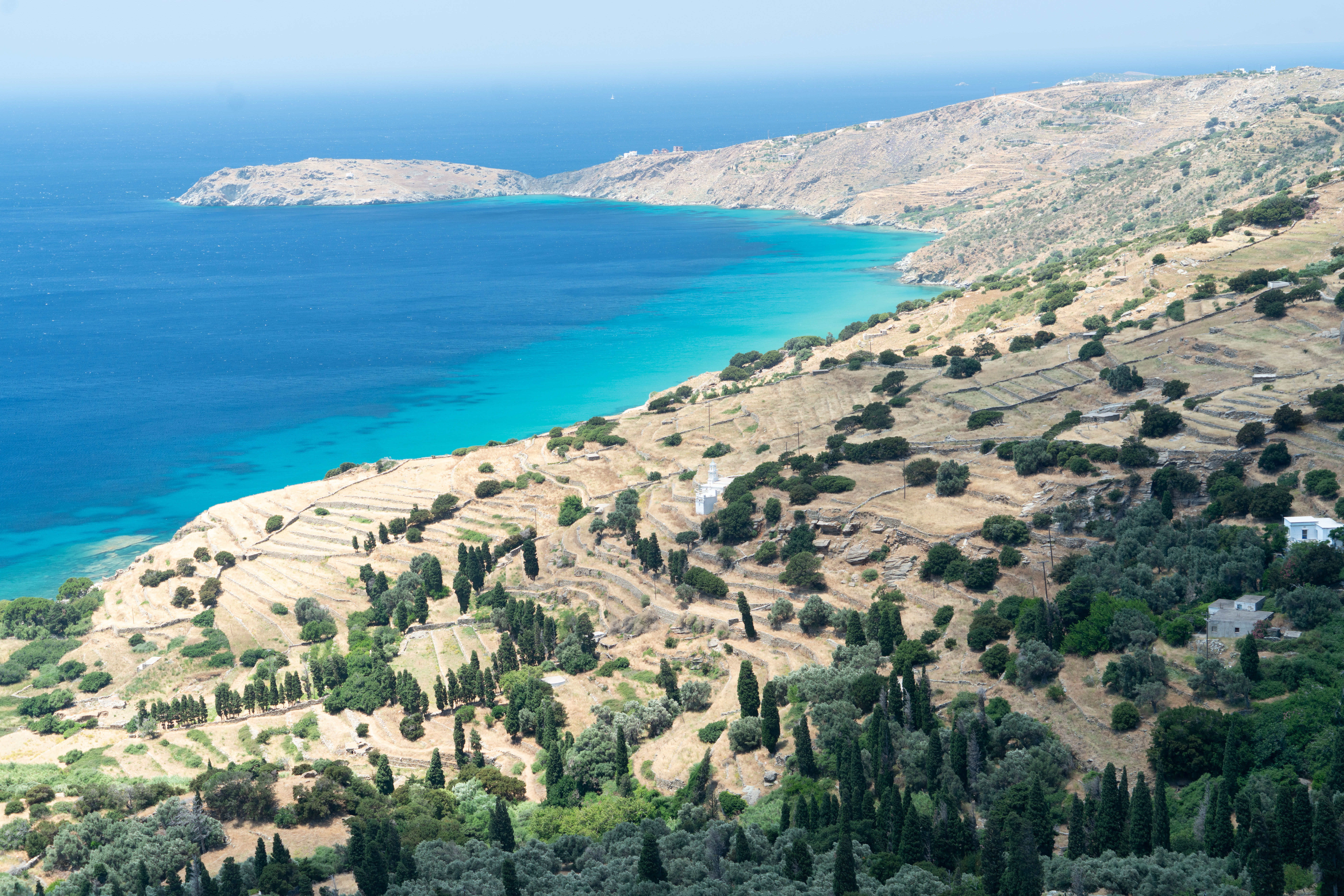 Chora를 답사하는 동안, 그곳의 고요한 아름다움과 시간이 멈춘 듯한 평화로움이 마음을 사로잡았다. 요새의 거친 돌과 마을의 부드러운 색채가 어우러진 풍경 속에서, 나는 안드로스 섬의 역사가 살아 숨쉬는 순간을 느낄 수 있었다. 안드로스 섬은 유럽인들이 즐겨 찾는 트레킹 코스로도 유명하다. 우리 일행은 그 중 하나를 골라 트레킹에 나섰다. 아무도 없는 오솔길을 따라 두시간 남짓을 걸어가는 그 길은 영원히 잊지 못할 추억이 되었다. 그리고 마지막 부분에 이르러 바다가 펼쳐진다. 까마득히 먼 곳에 자리한 교회의 모습은 이 세상의 것이 아닌 풍경을 선사한다.